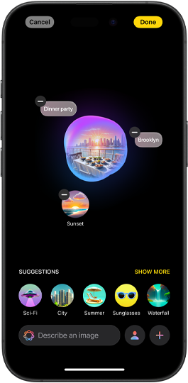 Create fun, original images with Image Playground right in your apps or its own dedicated app. You can try out styles like animation, illustration and sketch, and discover additional ChatGPT styles. Turn a rough sketch into a related image that complements your notes with Image Wand. Craft a custom memory movie in the Photos app. And make images inspired by your friends using Genmoji.3