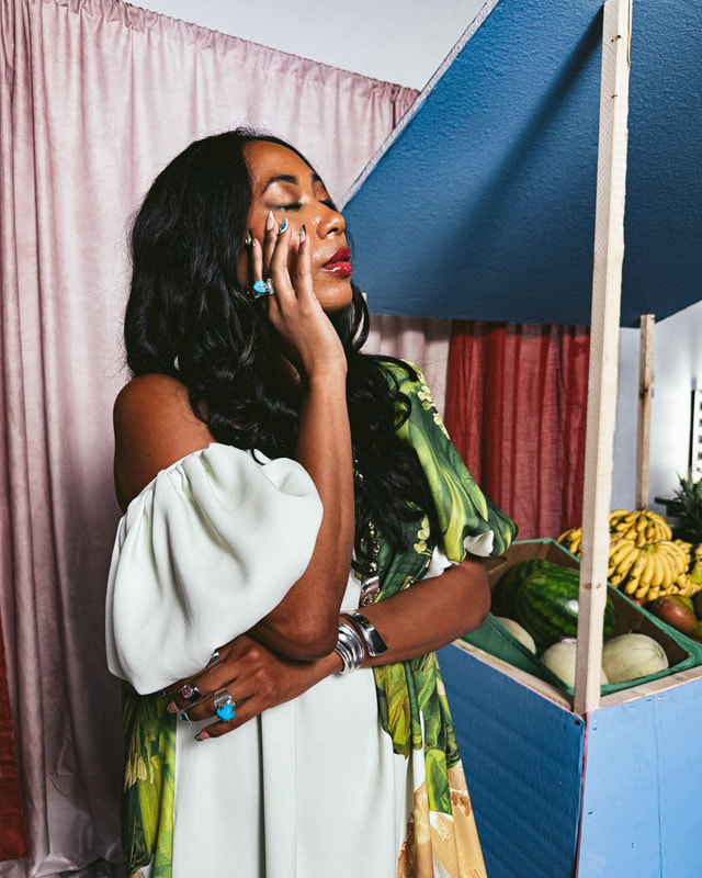 A portrait of designer Nia Thomas wearing a crocheted brown skirt and matching top, against a backdrop made to look like a fruit stand. Shot on iPhone 16 Pro Max by Karston Tannis.