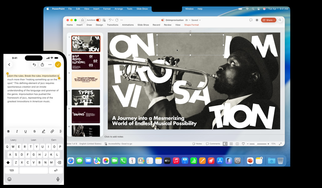 iPhone 16 Plus with text highlighted in the Notes app, 13-inch Macbook Air with a Keynote slide open, text from Notes app is visible on the slide